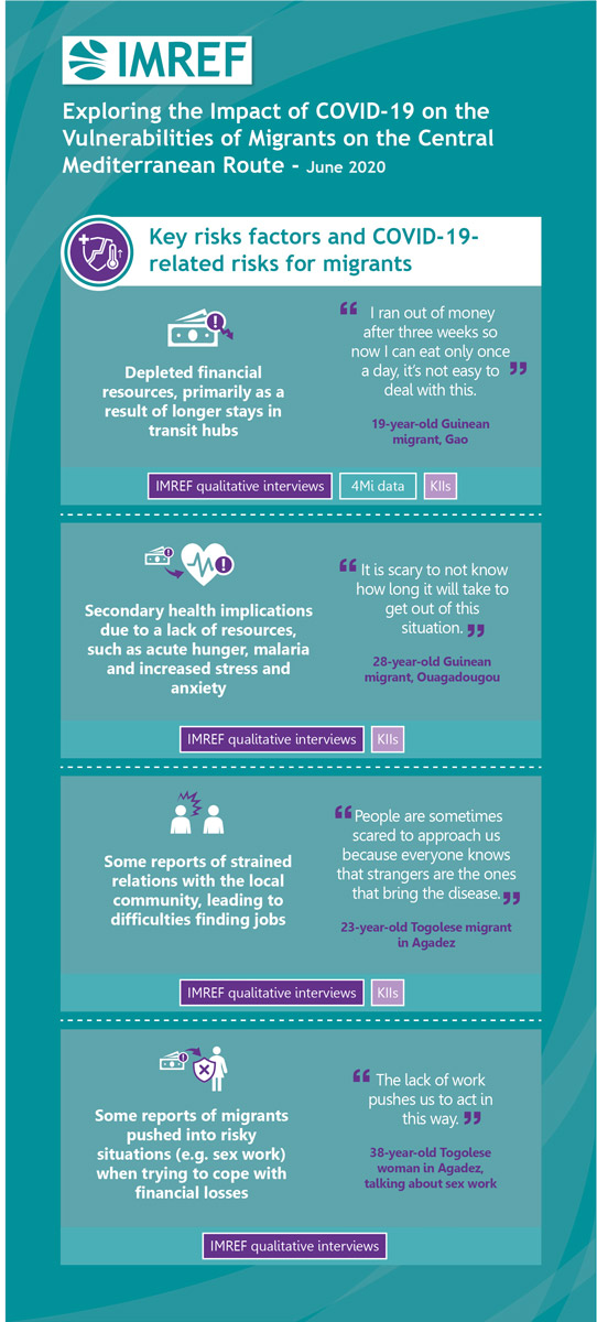 Along mixed-migration routes linking West Africa and the Mediterranean, migrants and refugees often travel in precarious situations, characterised by limited access to services, a lack of human rights protection, and increased risk of violence, exploitation, and abuse. As the COVID-19 pandemic emerged, the international community raised concerns about how the outbreak and measures put in place to slow transmission would affect the well-being of migrants and refugees and called on global COVID-19 responses to account for their needs. However, to support an effective response, humanitarian and development actors faced a dearth of information about how the pandemic was affecting people in migration flows.